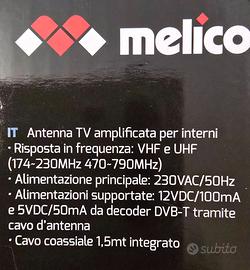 Antenna Amplificata Meliconi mod. AT49 Antenna amplificata per interni frequenza VHF e UHF 174-230MHz 470-790MHz guadagno 49dB per decoder DVB-T protezione da frequenze LTE (segnale Smartphone) collegamento tramite cavo antenna coassiale
