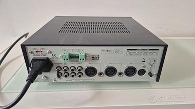 MA65 è probabilmente l'amplificatore di miscelazione più compatto e completo da 65 watt da 100 volt. Senza dubbio questo prodotto può essere il cuore di molti piccoli progetti di installazione in cui sono necessarie chiamate prioritarie o microfono e dispersione della musica di sottofondo. Inoltre, questo amplificatore può essere utilizzato anche nelle applicazioni mobili mentre il MA65 funziona con 24 volt (camion, autobus, alimentazione di emergenza). Il MA65 ha 4 ingressi: 2 microfoni, 1 microfono e 1 input di riga. Un sistema di priorità a due fasi è standard: MIC1 può avere la priorità attivata dalla voce (VOX) che disattiva tutti gli altri input. Questo muto VOX può essere spento tramite un jumper interno. La chiusura a contatto (tramite Din5 su MIC1 o Euro Block su MIC1-2) attiverà il carno e si disattiva input 3 (MIC3/Line3) e 4. L'input pre-amp out e power-amp consente di inserire processori di segnale extra o di collegare il segnale ad altri amplificatori di potenza. Inoltre, il MA65 è dotato di un controllo dei bassi: un controllo del tono degli alti, un circuito di uscita e limitatore sull'uscita per evitare il ritaglio.