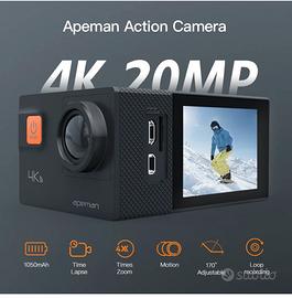 Action cam Apeman con una batteria originale, accessori vari e valigetta antiurto