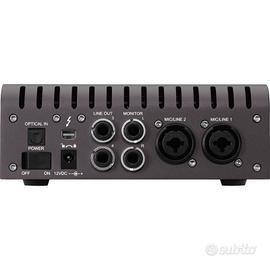 2 Preamp Mic / Line, 2 uscite di linea; ingresso strumento Hi-Z sul pannello frontale e uscita cuffie