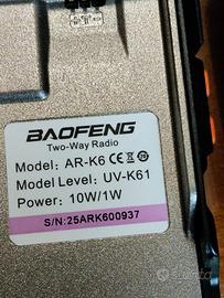 Marca Baofeng modello AR-K6 con Batteria da 2600 mAh - ricezione Air - Toni ripetitore DTMF - Nooa Americano - Schermo da 1,44 pollici - Multi Band - One Key Frequency Macht- Funzione Repeter -voce Encription - Stop Watch - Multi Band Wireless - Frequenza Copy cancellazione del rumore - 1750 Hz - Tone Burst - Luminosità regolabile ,Riflessione LCD - BATTERIA ricaricabile al litio - bbv la cronometro - Aggiornamento del firmware - Fast Copy One Channel. Gamme solo RX 76-108 108-136 350-390 500-620 MHz- RX e TX 144-146 430-440 220-260 400-520 MHz e altre con programmatore o con PRC Chirp da PC.Potenza 1 e 10 Watt.