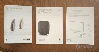Coppia di apparecchi acustici (Dx e Sx) PHONAK ricaricabili, mod. Audeo M50-R con base di ricarica "Phonak Charger" e accessorio "TV Connector" che permette di collegare gli apparecchi acustici tramite bluetooth alla TV o a qualsiasi sorgente audio come ad esempio un impianto stereo o un computer. Si fornisce anche una custodia Phonak per gli apparecchi acustici con strumento di pulizia.