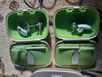 Come da foto vendo questi apparecchi acustici poco usati da mia suocera. Oltre agli auricolari c'è anche la docking station da collegare al televisore così che l'anziano potreà ascoltare la TV con il ricevitore al collo (collegato via bluetooth) alla docking station. Così non darà fastidio ad altre persone con volumi della TV esagerati e potrà a sua volta regolarsi il volume autonomamente negli auricolari. Tutto originale marca PHONAK e tutto funzionante.