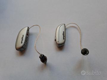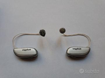 Apparecchio acustico Amplifon Energy R3 composto da due auricolari, stazione di ricarica, due contenitori da trasporto e set di deumidificazione.