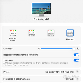 Vendo Apple Pro Display XDR da 32”, monitor professionale ideale per grafica, video editing e professionisti. Vetro standard lucido. Display Retina 6K (6016×3384) Condizioni: ottime, compreso di scatola e accessori Incluso nel prezzo adattatore originale VESA dal valore di 200€ (no stand) Vendo per passaggio a doppio monitor. NO SCAMBI NO PERDITEMPO NO OFFERTE Usato quasi introvabile. Accetto solo bonifico istantaneo, PayPal, Revolut, o contanti. Eventuale scambio a mano a Milano, zona Linate.