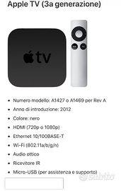 Vendo Apple Tv 3a Generazione, modello A1625, specifiche in foto. Non effettuo scambi, solo consegna a mano, non effettuo spedizioni, pagamento contanti.