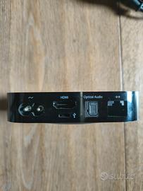 Vendo Apple TV di 3ª Generazione (modello MD199TY/A) in buone condizioni estetiche, solo qualche segno di usura, ma perfettamente funzionante. Supporta la risoluzione Full HD 1080p e, pur non essendo più aggiornabile per le app, la funzione di Airplay è ancora valida, quindi risulta ottima per trasmettere contenuti (foto, video e musica) da iPhone, iPad o Mac al televisore, con uscita audio Ottica eHDMI. La connessione può avvenire sia con WiFi che con porta Ethernet. Il contenuto include: Unità Apple nera Telecomando originale in alluminio Cavo di alimentazione Manuali e adesivi Apple Scatola