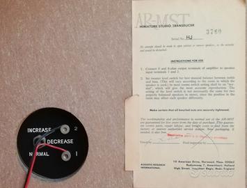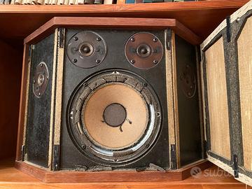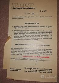 Coppia di casse Acoustic Research International AR-MST. Originali del 1975 o 1976. Sono presenti le istruzioni originali. Furono manutenute da specialista a Bologna a inizio anni '90, cosa di cui vado a memoria, non ho documentazione al riguardo. Ora vanno manutenute nuovamente, il suono gracchia un po' a seconda della tonalita'. Vedere foto per condizione. Numeri di serie consecutivi. Accetto solo ritiro di persona e pagamento in contanti. Sono disponibili con diverso annuncio anche coppia di casse AR-3a/improved.