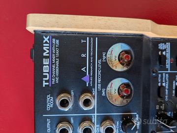 Vendo mixer ART TubeMix in ottime condizioni, perfettamente funzionante. Mixer compatto con circuitazione valvolare che aggiunge calore e carattere al suono e scheda audio USB integrata. Mixer solido e compatto della magnifica ART con preamp valvolare e VU Metterà e numerose possibilità di circuitazioni diverse. Ha anche una vera e propria scheda audio alimentata USB integrata utilissima per registrare. Usato con cura, nessun difetto, usato sempre in casa. Vendo a malincuore causa trasferimento all'estero. Includo alimentatore e scatola originale.