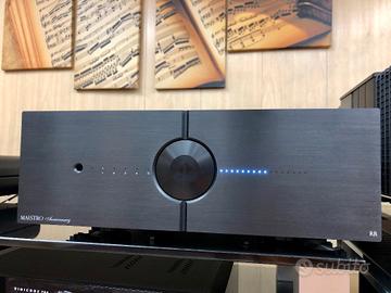 DISPONIBILE ESEMPLARE USATO IN CONTO VENDITA Listino: 12.950,00 euro Versione RR con Sezione pre interamente ridisegnata e nuovo controllo di volume RR (Relè e Resistenze, completamente analogico), con le seguenti caratteristiche: o garantisce un'elevata purezza del segnale e una durata utile di 10 milioni di azionamenti attraverso l'utilizzo di relè di segnale di alta qualità e resistori militari di precisione; o riduce i disturbi "click" e "pop" tipici dei comandi a relè; o mantiene un perfetto equilibrio tra canale destro e sinistro anche a bassi livelli di ascolto; o non utilizza amplificatori operazionali sul percorso del segnale per mantenere la nostra filosofia "Zero Global Feedback Il Maestro Anniversary nasce nei laboratori AIRTECH in seguito all'esperienza maturata con lo sviluppo del Puccini Anniversary. Lo schema di base è molto simile, ma con un'importante differenza: la catena di amplificazione è completamente bilanciata dall'ingresso fino allo stadio finale che torna ad essere sbilanciato per collegarsi ai diffusori. Questo ha comportato un raddoppiamento degli stadi di amplificazione ed attenuazione. Anche nel Maestro Anniversary tutti gli stadi sono privi di feedback globale. Il feedback non è utilizzato neppure sugli stadi di preamplificazione (come nel Puccini). La potenza di uscita è stata portata a 150W su 8Ω con il conseguente ridimensionamento di tutti gli stadi driver e finali che adesso usano quattro coppie di transistor per canale.