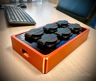 Multipresa per impianti hifi ed home theater, cablaggio a stella con cavo in rame ultra puro OCC, guscio color rame, piastre in plexiglass nero. 6 Prese non filtrate con coperchio anti polvere. Presa IEC contatti dorati.