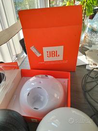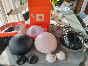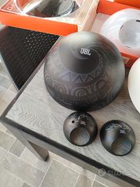Audio multimediale JBL Spot con subwoofer e due altoparlanti satellite a forma sferica in più due cover una bianca e una nera con disegni intercambiabili