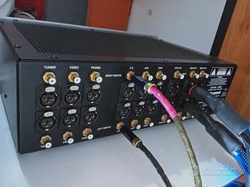 Vacuumtube audio circuit, solid-state power supply. Inputs (6): tuner,video, phono,CD, aux tape (XLR and RCA connectors). Outputs (3): 2 main, 1tape (XLR and RCAconnectors).