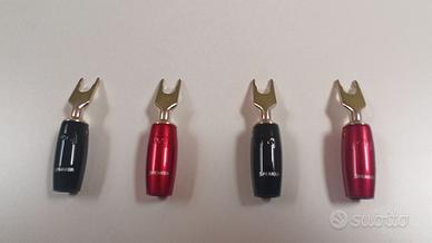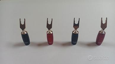 Vendo forcelle AUDIOQUEST SUREGRIP 1000 “SILVER” per passaggio a forcelle WBT 0761 in eccellenti condizioni. I connettori AUDIOQUEST SUREGRIP 1000 “SILVER” sono il top di gamma della linea AUDIOQUEST. Realizzati in puro rame rosso con rivestimento in argento diretto puro assicurano un suono notevolmente più pulito e chiaro nonché una separazione degli strumenti veramente notevole. Anche se il rivestimento in argento può sembrare opaco questo non è un problema in quanto ciò si verifica perchè non c'è uno strato sottostante di nichel brillante che può essere causa di distorsioni. L'uso dei connettori è importante perchè non solo garantisce una base di aggancio di superficie elevata ma anche perchè rispetto al cavo spellato non incorrono in ossidazione ed evitano spiacevoli inconvenienti per le apparecchiature collegate. Comprate da AUDIOTEKA a 186 euro tre mesi fa. Offerte al ribasso non saranno prese in considerazione. Possibilità di consegna a mano su Roma – Viale dell’Università.
