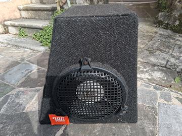 Subwoofer JBL a doppia bobina da 25 cm. ( non ricordo la sigla) inserito in cabinet a sospensione pneumatica con litraggio corretto e sagomato con inclinazione dei lati alti a seguire l' inclinazione schienale e portellone, con fissaggi per il passaruota destro della Fiat Cinquecento o seicento.