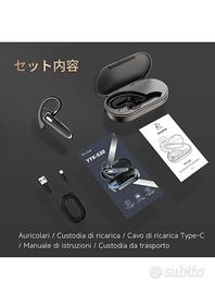 Auricolare Bluetooth 5.3 mono, utilizzabile sia all'orecchio sinistro che destro. Offre una riduzione del rumore CVC e un microfono HD per chiamate chiare. È un dispositivo ultra leggero e comodo, compatibile con sistemi operativi iOS e Android, garantendo fino a 20 ore di autonomia.