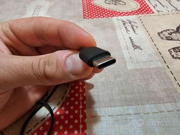 Auricolari AKG in-ear neri con controllo play/pausa, volume su/giù e connettore USB di tipo C. Le cuffiette sono state comprate da Samsung, usate poco e hanno una buona risposta sonora, in particolare i bassi se posizionate correttamente dentro l'orecchio.