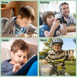 Auricolari wireless per bambini volume sicuro 85 dB, IPX6 •Design carino e dolce a forma di gatto: questi auricolari wireless a forma di gatto sono progettati per gli amanti dei gatti, le nostre cuffie per bambini presentano un design intrauricolare vivace e divertente con morbidi tappi auricolari in taglie S/M/L per adattarsi alle orecchie piccole di tutte le età, perfette per regali di compleanno, regali di Natale e regali per il rientro a scuola per ragazzi e ragazze (dai 6 anni in su) e persone care. •Bluetooth 5.3 e microfono integrato: questi auricolari per bambini sono dotati della tecnologia Bluetooth 5.3 per una connessione stabile per telefoni cellulari, tablet, laptop, Kindle e altri dispositivi con Bluetooth. Le cuffie per gatti per bambini, bulit con microfoni possono soddisfare le esigenze del tuo bambino per l'istruzione online, chattare e persino giocare. •Qualità del suono chiara e limite massimo di 85 decibel: gli auricolari Bluetooth COOTIMOCK per bambini di età superiore ai 6 anni dispongono di driver da 10 mm per una qualità del suono equilibrata e chiara, portando al tuo bambino un'esperienza musicale piacevole. Soprattutto, il limite massimo di volume di 85 decibel riduce il rischio di danni all'udito per i bambini che indossano gli auricolari per lunghi periodi di tempo. •Lunga durata della batteria, uso quotidiano: con il cavo di ricarica USB-C incluso, puoi goderti fino a 30 ore di riproduzione (con custodia di ricarica) con una singola ricarica rapida (1,5 ore), che soddisfa le esigenze dei tuoi bambini per ascoltare musica a lungo, guardare video, istruzione online, viaggi e così via. •Design umanizzato: gli auricolari wireless per bambini pesano solo 4 grammi (0,008 libbre) su un lato, e i morbidi tappi auricolari sostituibili offrono un'eccellente cancellazione passiva del rumore, i tuoi bambini non soffriranno mai di disturbi alle orecchie a causa di rumori come il ruggito in aereo durante lunghi viaggi in aereo o viaggi su strada