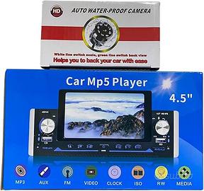 VENDO NUOVISSIMO AUTORADIO BLUETOOTH 1 DIN CON SCHERMO HD IPS DA 4.5 POLLICI CON VIVAVOCE AUX USB. Dettagli prodotto: Nuovissimo Stereo 1 din touch screen IPS HD da 4.5 pollici, lettore 1080P con Bluetooth, Radio FM / MP5 e ben 2 Porte USB, un Ingresso Aux ed un Ingresso per telecamera posteriore inclusa nella confezione. Mirror Link compatibile. Autoradio con schermo touch screen IPS HD da 4.5" pollici. Lettore video ad alta risoluzione 1080P. Supporto Bluetooth per chiamate vivavoce e Musica. Supporto MIRROR LINK. Supporto Ingresso telecamera per retrovisione inclusa. Formato video di supporto: RMVB / RM / FLV / 3GP / MPEG / DIVX / XVID / DAT / VOB / AVI / MP4. Supporta il formato audio: MP3 / WMA / OGG / APE / FLAC / WAV. Supporto formato immagine: JPEG / BMP / GIF / TIF. Gamma FM: 87,50 MHz-108,00 MHz. Sintonizzatore elettronico stereo, scansione e memorizzazione automatica delle stazioni. Spegnimento con funzione di memorizzazione della memoria automatica in modalità radio o SD / MMC / USB. Può caricare cellulare o tutti gli altri dispositivi USB. Effetto EQ piatto / Jazz / Rock / POP / Class / LOUD. Potenza d'uscita dell'amplificatore di 45 watts x 4 max. Luci colorate a conversione automatica. Orologio e data del display digitale 24 ore. Specifiche Tecniche: Dimensioni dello schermo: 4.5 pollici Tipo: 1 Din Colore: nero Tensione d'ingresso: DC12V Interfaccia: 2 USB / AUX IN Potenza uscita amplificatore / canale qtà: 45W * 4 Telecomando IR completo Funzione retrocamera (Inclusa nella confezione) Questo stereo per auto è compatibile con tutte le auto con predisposizione 1 DIN. L'installazione richiede una minima conoscenza dei prodotti elettronici. Si prega di installarlo con l'aiuto di professionisti. CONTENUTO DELLA CONFEZIONE: 1x AUTORADIO 1 DIN 4501AI 1x RETROCAMERA DI PARCHEGGIO 4 LED 1x TELECOMANDO CABLAGGIO COMPLETO COME DA FOTO.