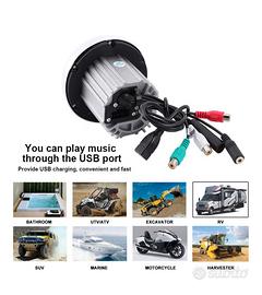 Supporta Bluetooth per musica wireless, riproduzione MP3, radio FM/AM e dispone di porta USB per ricarica e lettura dispositivi. Progettata per ambienti marini/piovosi con installazione semplice e dimensioni compatte.