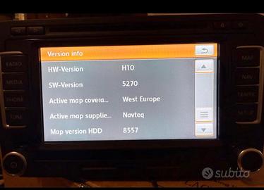 Vendo navigatore autoradio originale Wolkswagen RNS 510 versione P 2013 display touchscreen a led, multimediale :cd/dvd, sd, hd. Navigatore, mappe Europa West aggiornate 8557 V17 in 3d, comandi vocali, tmc... Compatibilita: golf 5, 6, passat, tiguan, touran,jetta, scirocco, eos, caddy, new polo, sharan,amarok,maggiolino ,california, t5, t6, skoda, seat. Ottime condizioni, perfettamente funzionante, aggiornato 5270 VIM con codice sblocco. No perdi tempo.