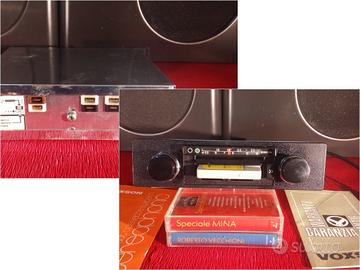 Rarissimo autoradio vintage VOXSON GN 2008 NUOVO, mai montato in macchina; testato e perfettamente funzionante. Riproduttore stereofonico per musicassette del sistema "compact cassette" con incorporata una radio a 2 gamme d'onda: OM e OL. Completo di documentazione originale dell'epoca (manuale d'uso, schema elettrico e garanzia), la vecchia scatola di imballo ormai sgualcita (vedi foto) + 2 cassette originali in omaggio (Mina e Vecchioni). Istallabile su auto d'epoca, ma anche su auto moderne, se volete. Circuito allo stato solido con 31 semiconduttori. Velocità del nastro 4,75 cm/sec. Controlli di volume e tono rotativi. Controllo del bilanciamento a cursore. Potenza di uscita 7 Watt per canale. Alimentazione batteria auto (12 volt con negativo a massa). Dimensioni: 170 x 150 x 53 mm. Per altre informazioni chiama il 3487146039 (utente col 100 % di feedback positivo anche su altre piattaforme. Questa è una vendita tra privati, con esclusione di garanzia e con la formula "visto e piaciuto".