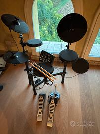 COME NUOVA - USATA 1 ORA Realkit One è un drumset elettronico di ultima generazione studiato per il batterista che vuole avvicinarsi allo studio dello strumento o semplicemente alla pratica giornaliera in situazioni nelle quali è necessario l'abbattimento del rumore. I pad sono velocity sensitive e offrono una dinamica paragonabile ai drumkit tradizionali. Per garantire la massima espressività, il rullante è provvisto di pad real feeling e ha 2 diverse zone di risposta (Head + rim). Il piatto crash offre la possibilità di stop immediato (choke) come nei drumkit di livello superiore. La centralina è provvista di un display LCD a 3 unità e un'interfaccia utente user-friendly. 20 preset offrono suoni di qualità per tutti i gusti e generi tutti quanti editabili singolarmente con 184 timbri disponibili. Per le vostre sessioni di pratica, sono invece presenti 50 demo song e la funzione metronomo. Caratteristiche •Drumkit elettonico completo da 5 pad e 3 piatti, pedale ottico Hi-Hat e pedale cassa •Pad rullante con pelle natural feel e 2 zone di risposta •Piatto crash da 12 con funzione choke, Ride da 12 e Hi-Hat da 8 •Centralina compatta con connettore unico per un setup comodo e veloce •20 suoni Drumkit preimpostati con possibilità di editing fino a 184 suoni per componente •50 Demo song con fuzioni drum only e mute •Rack pre-assemblato per una rapida installazione •Pedale cassa incluso nella confezione •3 pad da 8 Tom Tom + 1 pad da 6 grancassa •1 pad da 8 rullante con natural feel e 2 zone •1 piatto Crash da 12 con funzione Choke •1 piatto Ride da 12 •Hi-Hat da 8 aperto/chiuso •Pedale Hi-Hat con sensore Ottico •Pedale Grancassa con base in metallo •Rack preassemblato composto da 8 tubi e 14 clamp •Centralina compatta con design di ultima generazione •184 Voci, 20 preset Kit •50 brani demo, con funzioni drum only e mute •Metronomo regolabile con selezione istantanea •Uscita USB 2.0 •Uscita Headphone Jack da 1/4 (6,3mm), uscita Line out Jack da 1/4 (6,3mm)