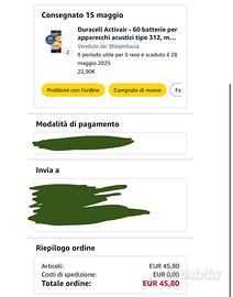 Vendo batterie acustiche Duracell per errore nell’acquisto.Credevo di aver acquistato le batterie adatte per l’apparecchio acustico,ma una volta arrivate,ho notato che non erano della giusta misura.Ho tolto il sigillo solamente ad una batteria,che come ho detto prima era stata usata solo come prova e la prova è durata letteralmente 5 secondi,perché si capiva già che non era adatta all’apparecchio.Inoltre,anche se non ha il sigillo,non è stata a contatto con parti che toccano l’orecchio,quindi è igienicamente assicurata.Le altre batterie sono ancora col sigillo d’acquisto e non sono mai state ne toccate ne cacciate dallo scatolo di plastica,quindi sono completamente nuove.Sono 10 scatolini di plastica contenenti ognuno 6 batterie.Inoltre,allego foto della ricevuta da dove ho acquistato le batterie,cioè amazon,che testimoniano quanto ho pagato in totale le batterie.Per qualsiasi informazione,dettaglio,foto in più o chiaramenti,contattatemi.Buona giornata.