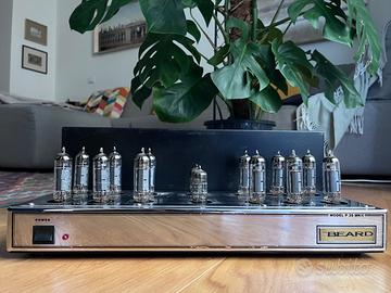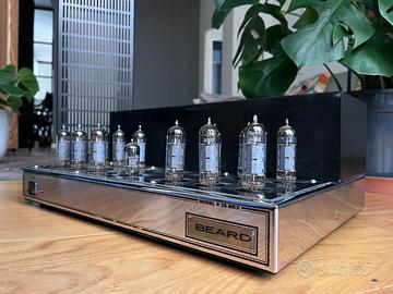 Finale di potenza Beard P35, caposaldo dell’ingegneria valvolare britannica firmato da Bill Beard. Finitura chassis acciaio cromato. Da me usato per vent'anni in accoppiata con il suo pre Beard CA35 (non in vendita) per pilotare dapprima dei diffusori da stand Opera Callas Gold e, negli gli ultimi 2 anni, con delle non facili Infinity Ren90 con ottimi risultati grazie ai suoi 35 watt per canale in pura Classe A! CONDIZIONI L'apparecchio è in ottime condizioni estetiche e funzionali. In vent'anni che è in mio possesso ha sostenuto i normalissimi interventi di manutenzione presso tecnico specializzato. Attualmente monta dodici EL84 Sovtek e due ECC81 Mullard. LE VALVOLE Devo far testare svariate svariate EL84, ne ho 36: 24 meravigliose Rektron (NOS produzione Philips), 12 JJ Electronics, tutte quante acquistate già selezionate in terzetti. Il finale verrà fornito con un set di valvole di potenza perfettamente efficienti. Nei prossimi giorni saró in grado di testarle tutte con prova valvole militare Hickok TV7-A/U. Devo inoltre controllare una coppia selezionata di Philips Miniwatt Ecc81 (12AT7) per la sezione di pilotaggio. SPEDIZIONE E IMBALLI Dato il peso (21kg) preferisco il ritiro a mano, ma posso spedire con imballi in robusta scatola di cartone inserita in ulteriore controscatola imbottita e, ovviamente, con le valvole smontate e protette anch'esse. Tracciatura del pacco. Offro precisione descrittiva e serietà, gradisco chiaramente altrettanta serietà. _______ DATI TECNICI Power output: 35 watts per channel into 8Ω (stereo) Frequency response: 5Hz to 50kHz Total harmonic distortion: 1% Input sensitivity: 0.775V Signal to noise ratio: 90dB Valve complement: 12 x EL84, 2 x ECC81 Dimensions: 445 x 150 x 335mm Weight: 21kg