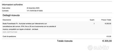 Vendo Beats Powerbeats Fit modello nuovo pari a nuovo usate pochissimo acquistato il 22 dicembre 2025. Prodotto originale come da ricevuta di acquisto allegata. Vendo per passaggio ad altro modello massima serietà Come si legge dai feedback ! Non trattabile !