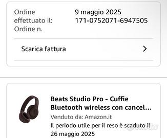 Vendo Beats Studio Pro colore Caffè, acquistate su Amazon il 9 maggio 2025 (ancora in garanzia). Cuffie pari al nuovo, utilizzate pochissimo e sempre tenute con cura. Le vendo esclusivamente per scarso utilizzo. 🔊 Caratteristiche principali: •Cancellazione attiva del rumore (ANC) •Modalità Trasparenza •Audio spaziale •Connessione Bluetooth + cavo jack •Ottima qualità audio e comfort elevato 📦 Dotazione completa: •Cuffie •Custodia originale •Cavo USB-C •Cavo audio jack •Scatola originale 💡 Su Amazon nuove costano circa 297 €. 📍 Consegna a mano in zona Milano Massima serietà, no perditempo, disponibili per prova dal vivo.