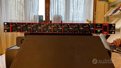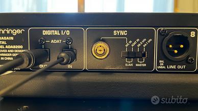 Behringer ADA8200 (Ultragain Digital) in condizioni pari al nuovo. Perfettamente funzionante. Senza scatola originale, ma in perfetto stato di funzionamento, senza difetti estetici o funzionali. Caratteristiche principali: • 8 preamplificatori microfonici progettati da MIDAS con alimentazione phantom a 48 V • Convertitori AD/DA Cirrus Logic a 24 bit: puliti e precisi • I/O ottici ADAT: espandono qualsiasi interfaccia dotata di ADAT di 8 canali • Ingresso/uscita word clock per la sincronizzazione • Funzionamento a 44,1/48 kHz • Formato rack 1U Compagno ideale per l'Audient EVO 16 (disponibile anche separatamente): insieme offrono 16 ingressi simultanei. Condizioni: Come nuovo, completamente testato e funzionante. Senza scatola originale.