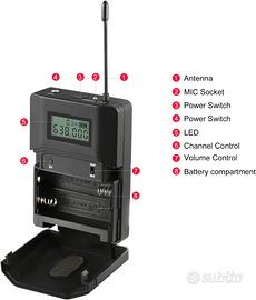 Questo microfono della fotocamera adotta la banda di frequenza UHF e il circuito anti-interferenza composito e sei canali selezionabili. Con una forte capacità anti-interferenza, è possibile utilizzare 4 set contemporaneamente.