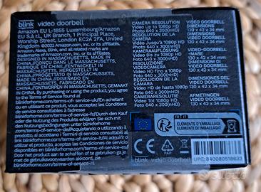 Rispondi alla tua porta ovunque tu sia dal tuo smartphone, con video in HD a 1080p di giorno e video a infrarossi di notte, e audio bidirezionale. Batteria di lunga durata, notifiche personalizzate, impostazioni di privacy e molto altro ancora. Ricevi una notifica ogni volta che viene rilevato un movimento o un visitatore suona il campanello Blink Video Doorbell. Collega il dispositivo al sistema di cavi preesistente del tuo campanello o abbinalo al Sync Module (venduto separatamente) per usufruire delle funzioni video in diretta e audio bidirezionale su richiesta. Salva e condividi i video localmente con Sync Module 2 e una chiavetta USB (venduti separatamente) oppure nel Cloud con 30 giorni di prova gratuita del piano d’abbonamento Blink. Progettato per adattarsi a ogni casa: connettilo via cavo al tuo campanello per associarlo al suono esistente. In alternativa, puoi ricevere avvisi sullo smartphone o utilizzare Blink Mini 2 (venduto separatamente) come campanello interno plug-in, senza alcun collegamento via cavo. Configura il tuo dispositivo in pochi minuti con le due batterie al litio AA incluse e poi connettilo al Wi-Fi nell’app. Il nuovo sigillo interno del vano batteria garantisce una resistenza agli agenti atmosferici, con un grado di protezione IP54. Funziona con Alexa: ricevi notifiche e rispondi con l’audio bidirezionale. Quando associato a Sync Module (o in modalità via cavo con un campanello interno compatibile), è sufficiente chiedere ad Alexa di rispondere al citofono. La confezione include un dispositivo Blink Video Doorbell e un kit di montaggio (incluse viti e tasselli). Sync Module 2 non è incluso, ma è disponibile in tutti i sistemi di cui sopra (consigliato per un uso ottimale in modalità wireless)