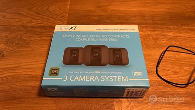 Vendo Blink XT 3 camera system per uso outdoor e indoor. Perfettamente funzionante con l'app attuale Blink iOS e Android. Il sistema è composto da: - Sync module da attaccare alla corrente con il caricatore incluso - 3 Camere XT che funzionano con pile AA da 1.5v al Litio - Le pile AA non sono comprese - Non è compatibile con Alexa. - Comprende 2 supporti camera della versione successiva. - Funziona Prezzo di listino 299€