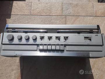 Boombox JVC RC 656 L. Ripulito da sporco e polvere, integro e completo di tutte le leve e manopole. In buone condizioni estetiche nonostante la sua età. Antenne originali, dritte e integre. La radio funziona con buona sintonia in fm stereo e ottimo audio. Il lettore cassette funziona in play e in riavolgimento veloce.