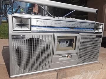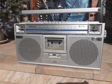 Boombox JVC RC 656 L. Ripulito da sporco e polvere, integro e completo di tutte le leve e manopole. In buone condizioni estetiche nonostante la sua età. Antenne originali, dritte e integre. La radio funziona con buona sintonia in fm stereo e ottimo audio. Il lettore cassette funziona in play e in riavolgimento veloce. Dimensioni 47x24x12
