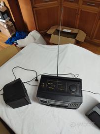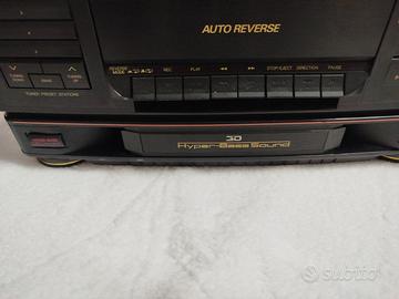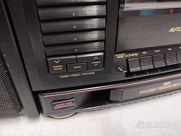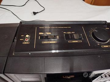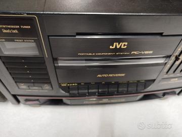 Boombox ghettoblaster vintage della JVC modello PC-V66 dotato di radio e mangiacassette. Estetica buona e funzionante. Unico piccolo difetto è una delle levette dell'equalizzatore si è staccata e si muove liberamente. Le altre sono ok. Dotato di bass booster, autoreverse e selezione canali radio preferiti. Alimentazione sia con batterie (quelle rotonde grosse) sia a normale corrente 220v