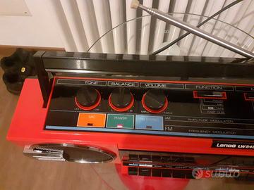 Boombox Lenco LW 545. Color rosso, in buone condizioni generali. Integro senza parti rotte o spaccate. Ripulito da sporco e polvere. Radio funzionante con discreta ricezione in fm stereo, il lettore cassette funziona piastra a con buona riproduzione audio, la piastra b gira regolarmente ma riproduce a volume bassissimo. Cedo come non funzionante per ricambi, per restauro, o per adeguamento ai nuovi standard con inserimento di ricevitore bluetooth .