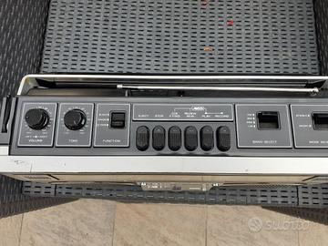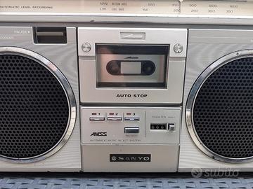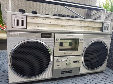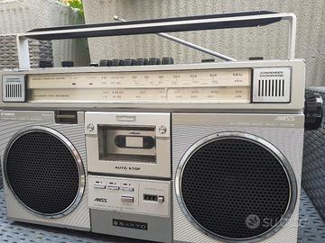 Boombox Sanyo mod. M4200LU. Ripulito da sporco e polvere. Esteticamente in buone condizioni, qualche piccolo segno del tempo ma che non ne compromette la gradevolezza dell'oggetto. Integro senza parti rotte o mancanti, antenna integra e dritta. la radio funziona con buona sintonia in fm stereo e ottimo audio anni 80. Il lettore cassette funziona sia in play, con buona riproduzione delle cassette, che in riavolgimento veloce.