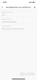 BOSE QuietComfort 35 series II modello attualmente in vendita a 170€ colore nero Cuffie over ear bluetooth qualità audio senza paragoni Riduzione del rumore configurabile a 3 livelli integrazione con Alexa funzione Music Share, che permette di riprodurre musica su piu dispositivi contemporaneamente perfettamente funzionante, esteticamente in ottimo stato con piccoli segni di usura attorno all'archetto comprensiva di borsa per il trasporto originale BOSE cavo di ricarica USB nuovo come sempre in foto trovate il seriale del prodotto, per eventuali controlli originalità [RIF 21368607456 CF0] 📍Venduto da negozio specializzato in articoli elettronici 🖼 Foto reali: ricevi esattamente l’articolo mostrato ✅ Testato, funzionante e garantito 🛡 14 giorni di garanzia 🚚 Spedizione entro 24h con corriere tracciabile a scelta 📦 Imballaggi professionali ➕ Possibilità di acquisti combinati con un’unica spedizione 📞 Assistenza post-vendita rapida e disponibile per ogni esigenza Contattaci senza impegno!