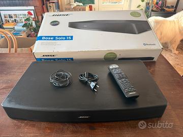 Bose - Sistema audio Bose Solo 15 TV: Il Sistema Audio Home Cinema Bose Solo 15 TV è semplice da collegare al Tv, ed offre un suono nitido e straordinario. Praticità di un solo collegamento per un suono TV straordinario, può essere posizionato sotto gran parte dei televisori con piedistalloed, semplice regolazione dei bassi e impostazione ottimizzata per la voce. Telecomando universale per gestione anche della tv, dvd, bluetooth, aux ,sat. Gestione del volume direttamente da telecomando sky. Ottime condizioni. Incluso telecomando, cavo ottico e hdmi e confezione originale. Vendo per passaggio a sistema 7.1.