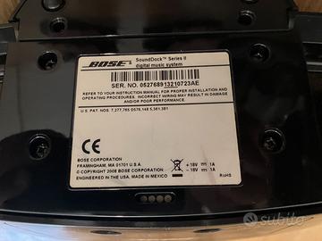 Vendo sistema BOSE SOUND DOCK II per iPod e iPhone al con connettore DOCK ma anche per qualsiasi altra sorgente input grazie all'ingresso per JACK 3,5 mm. Perfettamente funzionante, poco usato e discretamente conservato, con alimentatore e telecomando originali.