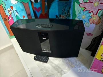 Bose Soundtouch 30 serie III colore total Black . Ottime condizioni completo di telecomando e filo alimentazione. Il potente sistema musicale wireless Bose offre prestazioni ottime connessione wireless tramite la rete Wi-Fi di casa, app dedicata, compatibile anche con i dispositivi Bluetooth . Possibilità ritiro a mano zona Eur. •No scatolo originale. •Prezzo non trattabile.