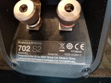 Coppia diffusori B&W 702 S2 in ottimo stato. Colore nero. Sensibilità: 90 dB Impedenza nominale: 8 ohm Potenza raccomandata: 30W-300W Dimensioni: 994x200x337 cm Peso: 29,5 kg l’una