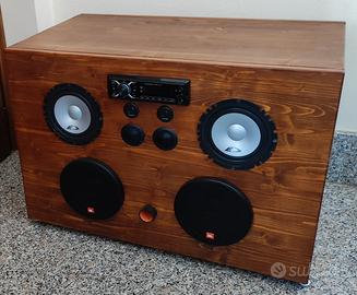 Box audio autocostruito, presa 220v con alimentatore 12v, possibilità di montarlo anche in macchina, 4 casse 6.5 ", le JBL per i bassi e altoparlanti Alpine per i medi, 4 tweeter.