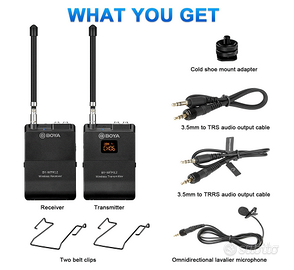 Contenuto della confezione: un trasmettitore BY-WFM12, un ricevitore BY-WFM12, un microfono a collo d'oca BY-UM2, un cavo di uscita audio da 3,5 mm a TRS, un cavo di uscita audio da 3,5 mm a TRRS, un microfono lavalier omnidirezionale, un parabrezza in schiuma, uno supporto per microfono, due fermagli per cintura, un adattatore per montaggio su slitta, custodia per il trasporto, manuale utente