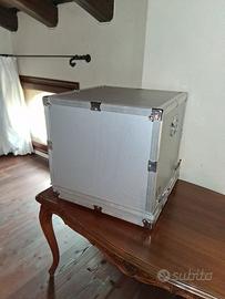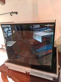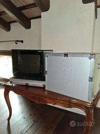 Brionvega, televisore cubo glass in cristallo a specchio, dentro valigia in alluminio, cm h 38x28 perfettamente funzionante e Carrello tv Teulada, produzione Zanotta anni '90, design Lluis Clotet e Oscar Tusquets Blanca. In ottime condizioni estensibile in lunghezza.
