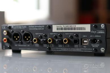 Ottime condizioni, perfettamente funzionante. DAC classico Cambridge Audio, molto apprezzato per qualità sonora e versatilità. Non spedisco. Dati tecnici: DAC con upsampling ATF a 24 bit / 192 kHz Convertitori: dual Wolfson WM8740 Ingressi: USB, 2× coassiale, 2× ottico Uscite: RCA e XLR bilanciate Supporto: fino a 24 bit / 96 kHz (USB limitato a 16/48) Risposta in frequenza: 20 Hz – 20 kHz ±0,1 dB THD: ~0,001% SNR: ~112 dB Dimensioni: 215 × 52 × 191 mm Alimentazione esterna 12V