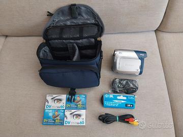 Accessori presenti: cavo AV per collegamenti, cavo Firewire IEEE1394 4 poli per collegamento digitale con PC, custodia e cinghia a tracolla. In omaggio 4 cassette DV da 60'.